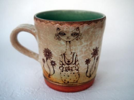 ・外側は化粧土を筆塗りした上から、下絵の具を銅版画で刷って焼き付けて絵付けしています。