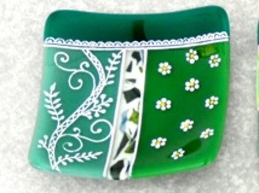 ・白いガラスのベースに鮮やかな数種の緑をパッチワークのように組み合わせ、白いガラスの粉で模様を描き、焼き付けてあリます。